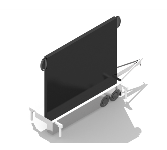 The mobile trailer and screen have built-in motion sensors and speakers. The trailer stands fold inwards and a cover can be placed on top for user safety.