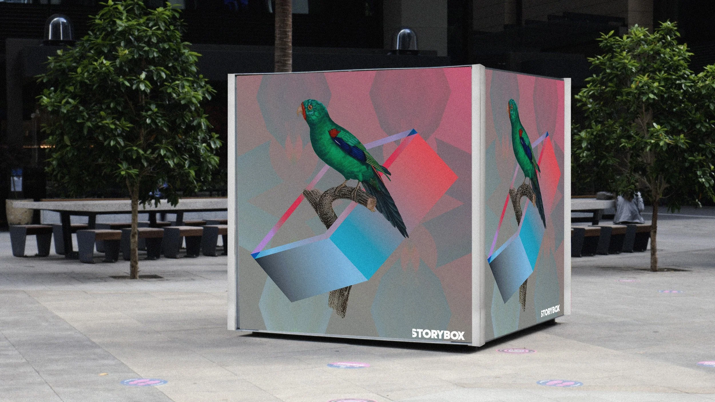 STORYBOX.co is a four-panel LED cube that is a digital canvas for sharing community stories, culture, and art. It encourages engagement by displaying past stories and inspiring future discussions. It includes interactive features, like a "mood ring" that shows community feedback from an online quiz.