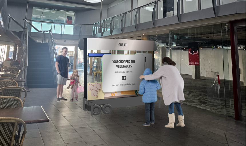 On the screen is an interactive motion sensor cooking game that adds and saves scores of players if a QR code is scanned. A discount or voucher is required for the businesses promoted at the end of the game.