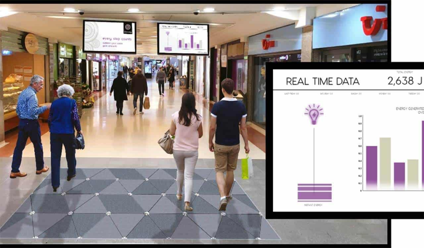 Screens show how much electricity is generated from steps, which can be exchanged for in-store rewards.